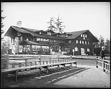 As for the golfers, although the property could be reached by dirt and plank roads that went to Richmond Beach, most people, even most wealthy people, didn't own automobiles, or considered the primitive road inadequate.[34] It took an hour to drive the 11 miles from Downtown Seattle.[35] That was solved when Stone & Webster agreed to build an east-west branch line off of their Seattle-Everett Interurban line to serve the new location with an electric shuttle car.[22][36] By 1918, members either lived in the nearby Highlands or arrived almost entirely by automobile, and the shuttle was discontinued, as eventually was the Interurban.[37]