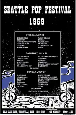 The Seattle Pop Festival was a music festival held at the Gold Creek Park, 16020 148th Ave NE, Woodinville, Washington from July 25 to July 27, 1969. The event was organized by Boyd Grafmyre.[1]