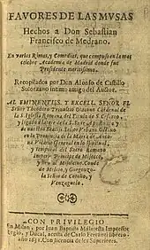 Favors of the Muses, miscellany by Sebastián Francisco de Medrano, was published in Milan in 1631 by Juan Bautista Malatesta, as indicated in the description on its cover: "Favors of the muses, made by Don Sebastian Francisco de Medrano. In several Rhymes, and Comedies, which he composed at the most famous Academy of Madrid where he was Most deserving President. Compiled by Don Alonso de Castillo / Solorzano, close friend of the Author. Milan, Juan Baptista Malatesta, at the expense of Carlo Ferranti, 1631".[24] The first volume includes:[25]