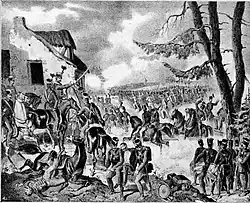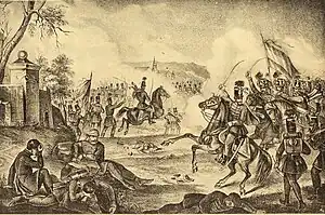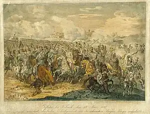 After the 8th Cavalry battery had ceased fire, the Poles moved forward.[36] In order to intercept the attack and allow the artillery to retreat, Lieutenant-Colonel Josef Regelsberg also launched an attack with his dragoons. However, the line of the Lieutenant-Colonel's Squadron under his personal command - despite of their rifle fire - was broken by the Uhlans, who attacked with greater momentum in a closed order.[36] But after that, the Poles were outnumbered, surrounded, and, no longer having the advantage of their pikes in close combat, suffered heavy losses.[36] However, they were soon rescued by a company (probably the 2nd) of the 2nd Hussar Regiment's Lieutenant-Colonel's squadron led by Vice-Captain Aurél Mukits, which had been covering the 8th Cavalry Battery, and together they routed the Imperial Cavalry.[36] The Major's Squadron of the Dragoons, led by Major Prokop Dobrzonsky (Dobrženský), also on the attack, fared even worse.[36] While their attack was just starting, the 2nd Major Division of the 3rd Hussar Regiment from the reserve arrived on the right flank of the Hungarian cavalry with the other half of the 1st Cavalry battery, and after a lightning-fast unlimbering of the half-battery led by Lieutenant Schiedebaum, he shot grapeshots into the approaching dragoons, thus breaking their ranks, and causing them disarray. The disoriented Dragoons were then attacked by the 1st Major's Squadron of the 2nd Hussar Regiment led by Captain Teodor Rudzinsky, who, with the order "Cut the officers!", encircled the enemy from the right and drove them back to the line of the 5th imperial Infantry battery and the 1st 12th half Infantry battery.[36] The scattered imperial cavalrymen, artillerymen, and charioteers managed to prevent the breakthrough in hand-to-hand combat and salvage the batteries' ammunition but suffered significant losses in personnel, and a total of 5 ammunition wagons were captured by the Hussars.[36] Meanwhile, on the other side too, the fight was decided. The 3rd Hussar Regiment's 1st Company of the 2nd Major's Squadron (perhaps its 2nd wing ) led by First Lieutenant János Melczer, which until then had probably been covering half of the 1st Cavalry battery, also received permission to charge.[36] Melczer cut through the still-fighting troops and got into the flank of the 1st Imperial Cavalry Regiment, then after scattering the Ban's hussar platoon, which served as cover, he threw himself on the battery with his hussars and captured two guns.[36] First Lieutenant Arthur Bylandt managed only to send the other half of his battery to the rear. Then, in pursuit of the fleeing dragoons, Poniński arrived with a platoon of Uhlans, as well as a section of Mukits's hussars. Together they broke the resistance, causing the loss of two-thirds of the 1st Cavalry battery's personnel, as well as a total of three guns, five ammunition wagons, and two other carriages.[36] The rest of the escaping artillery and Dragoons joined the main body of the brigade at the bridge, while the rest of them probably pushed themselves to the other bank through the marsh.[37] Thus the organized resistance of the imperial troops collapsed here, and the way was opened for the Hungarian cavalry to the northern bridgehead of the stone bridge over the ditch.[38]