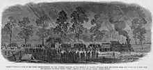 At dawn on August 18, Warren advanced to the south through rain and over muddy roads, pushing aside Confederate pickets and a cavalry brigade, and reached the railroad at Globe Tavern around 9 a.m. Parts of the division under Brig. Gen. Charles Griffin began to destroy the track while a brigade from Brig. Gen. Romeyn B. Ayres's division formed in line of battle and moved north to block any Confederate advance from that direction. Brig. Gen. Lysander Cutler's division was held in reserve. Ayres encountered Confederate troops at about 1 p.m. and Warren ordered the division under Brig. Gen. Samuel W. Crawford to move forward on Ayres's right in an attempt to outflank the Confederate left.[7]