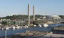 The freeway was planned to be extended south to SR 516 in the 1970s after a 4-mile (6.4 km) right-of-way was acquired by WSDOT before the project was canceled due to public opposition.[40] The King County Department of Public Works recommended extending SR 509 southeast from South 188th Street to I-5 in 1988, with construction planned to begin in 1999 at an estimated cost of $252 million in 1996,[39][41] raised to $1.4 billion a decade later.[42] A freeway bypass of the Port of Tacoma for SR 509 was proposed in 1990 as a supplement to the newly completed I-705 and funded with a $180 million grant from the Federal Highway Administration approved the following year.[43] Construction began in early 1994 amid controversy over the freeway's effects on the redevelopment of the Thea Foss Waterway.[44][45] The first section of the new freeway opened in August 1995, while the cable-stayed bridge over the Thea Foss Waterway and single-point urban interchange with I-705 opened on January 22, 1997.[46][47] The project cost a total of $165.3 million to construct, with the majority of funds from the federal government and a land claims settlement with the Puyallup Tribe.[47] The Blair Bridge was closed and demolished to make way for a wider channel on the Blair Waterway for larger container ships.[48]