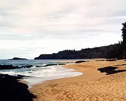 Clearly visible to the east is Kilauea Lighthouse set atop a cliff that faces Moku'ae'ae Island. About a quarter mile beyond the west end of the beach is a substantial waterfall that plunges about 15 feet into the Pacific Ocean.[3]