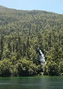 Secretary Island (Māori: Ka Tū-waewae-o-Tū) is an island in southwestern New Zealand, lying entirely within Fiordland National Park. Roughly triangular in shape, it lies between Doubtful Sound / Patea in the south and Te Awa-o-Tū / Thompson Sound in the north, with its west coast facing the Tasman Sea. To the east of the island, Pendulo Reach connects Te Awa-o-Tū / Thompson Sound with Doubtful Sound / Patea. Steeply sloped, the entirely bush-clad island rises to a chain of several peaks higher than 1000 metres. The highest of these is the 1,196-metre (3,924 ft) Mount Grono, the highest peak in the main New Zealand chain not located in the North or South Island. The island also contains three lakes. The largest, Secretary Lake, over 600 metres (2,000 ft) long, is located beneath Mount Grono at an altitude of 550 metres (1,800 ft).[1]