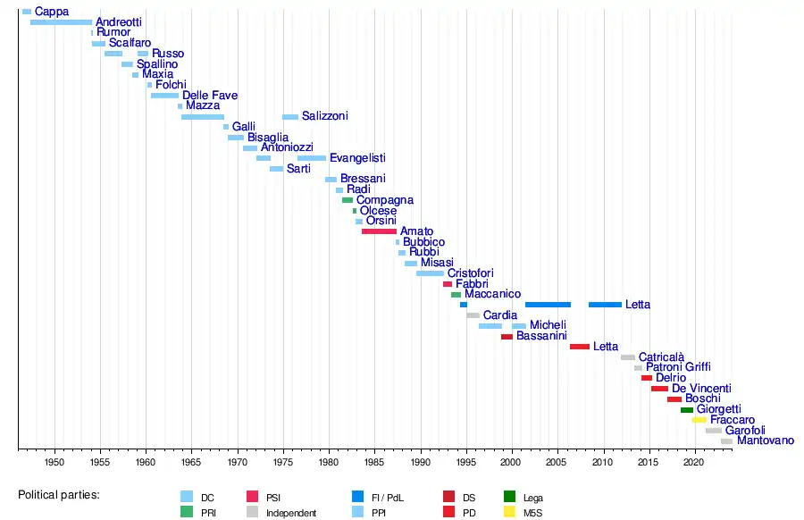 31 May 1947 | 18 January 1954 | 6 years, 232 days | Christian Democracy | De Gasperi IV·V·VI·VII·VIII Pella |