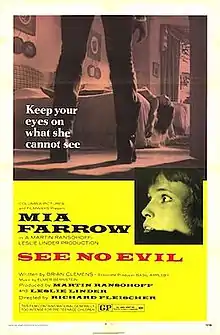 See No Evil (released in the United Kingdom as Blind Terror) is a 1971 British psychological horror-thriller film directed by Richard Fleischer and starring Mia Farrow as a recently blinded woman who is stalked by a psychopath while staying at her family's rural estate. Fleischer called the film "sheer entertainment" made "to scare the hell out of audiences."[3]