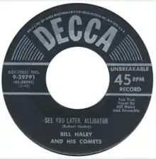 "See You Later, Alligator" is a 1950s rock and roll song written and first recorded by American singer-songwriter Bobby Charles. The song was a Top Ten hit for Bill Haley and His Comets in 1956 in the United States, reaching no. 6 on Billboard and CashBox. In the UK, the single peaked at no. 7.