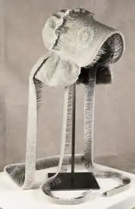 On the exterior of the bonnets, there are simple designs created with pins such as circles and lines. The Church of the Latter Day Saints refers to the "seer stone" as a prophetic tool used by Joseph Smith to receive messages and foresight from God.[5] Ellsworth’s circular designs along with the title of her series link the bonnets to the seer stones. Historically in the Mormon faith, seer stones were used by men to receive revelations. Ellsworth gives the bonnets seer symbols of stones, connecting these tools of visions to the women.[2] Ellsworth highlights the polygamous history of LDS and the roles of the wives while removing them from the control of the men. Ellsworth constructed the traditionally soft and malleable object of bonnets into sharp and durable sculptures, in turn recontextualizing the Mormon wives in the same way.[2]