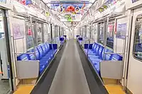 During the refurbishment period, unrefurbished 6000 series sets were affixed with "Y" stickers to indicate their incompatibility for Fukutoshin Line workings.[12] Between 2008 and 2015, the original LED passenger information displays were replaced with 15-inch, double-screen LCD displays.[1]