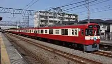 From July 2014, set 9103 was repainted in a "Red Lucky Train" livery in collaboration with the private railway operator Keikyu. In return, Keikyu painted one of its own N1000 series sets into an all-over yellow livery similar to the Seibu livery in May 2014.[6] Set 9103 was repainted in an all-over red livery after it was modified for Tamako Line operation.[7]