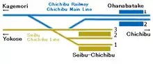 Seibu-Chichibu Station is the terminus station of the Seibu Chichibu Line, and is located 19.0 km from the opposing terminus of then line at Agano.[1] Some Seibu trains continue to Mitsumineguchi Station on the Chichibu Main Line of Chichibu Railway via a crossover between the two lines. Some Seibu trains also run to Nagatoro Station in the opposite direction of the Chichibu Main Line, however those trains do not stop at Seibu-Chichibu Station due to the layout of the crossover track.