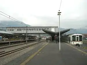 The station consists of one island platform and one side platform serving three tracks. The side platform is adjacent to the station building, which is connected to the island platform by a footbridge.