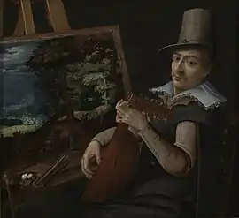 The painting portraits the artist, elegantly dressed and holding a lute, sitting before his palette and easel, on which a landscape painting sits.[1]