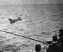 Approximately 40 days into their journey the men spotted a passing ship, but attempts to attract its attention failed; in the following days, two more ships passed by without noticing them. Finally, around 3 p.m. (local time) on March 7, after drifting for 49 days, they were spotted by two S2Fs launched by USS Kearsarge in stormy waters 1,200 miles (1,900 km) off Wake Island, and consequently rescued.[3]