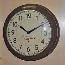 The relationship of the Self Winding Clock Company with Western Union (WU) began with an agreement between the companies of June 1889.[8] Its subject matter was for the transmission of time signals over Western Union telegraph lines to synchronize clocks made by SWCC. The company owned the clocks and WU installed and maintained them for a monthly fee, ranging from $1.25 to $2.00 per clock. SWCC was paid a percentage of the rental fee for providing clocks for WU customers.[9] If the clock movements required major repairs, they were sent to a SWCC repair facility and a replacement movement was installed by WU at the customer location. The partnership between SWCC and WU ended in 1963 when, as part of a lawsuit settlement, WU purchased all the rental clocks from SWCC. By the late 1960s, the time-service business had run its course and ceased to be profitable. Most of the clocks were simply abandoned.
