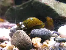| A live individual of Semisulcospira kurodai viewed through the glass of an aquarium | |