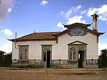 The Sendim railway station consists of the passenger building, a covered pier, a toilet building and a staff housing and water tank building.[12] The passenger building has a rectangular floor plan and single-storey façades, ending in a cornice and simple eaves, plastered and painted white, with eleven blue and white figurative tile panels depicting monuments from the region, landscapes and country scenes from the period, panels under the openings, a polychrome panel with the coat of arms of Portugal and two toponymic panels.[12] The main façade faces east.[16] The interior is divided into two unequal areas: the smaller one to the north, corresponding to the stationmaster's room, and the one to the south, corresponding to the public area, with a porch and waiting room, and the service area, with a telegraph office, ticket office and dispatch area.[12] The walls are covered in polychrome azulejos[10] made by Gilberto Renda.[17][18][19]