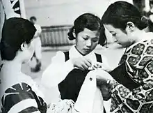 - Women in the animated film In This Corner of The World (この世界の片隅に, Kono Sekai no Katasumi ni) stitch senninbari, both as women waiting for stitch contributions by other women outside of public buildings, and as a familial task making "good luck blankets".