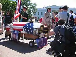 The protest march started near the White House in Lafayette Park where many protesters raised placards to show their disapproval of the war and to demand impeachment of the President for war crimes. One father brought a flag-draped coffin, as a memorial to his son who was killed in Iraq. The parent placed the coffin near the fence at the White House expressing President Bush's culpability in the deaths of U.S. troops who have died in Iraq. Other signs were raised proclaiming that the U.S. occupation of Iraq is illegal and that U.S. troops should be supported by bringing them home.