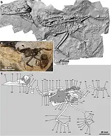 The fossil remains show soft tissue preservation, mostly in the thoracic and abdominal cavities, though portions were also seen in the skull. Apart from remains of potential food material, these remains have not been thoroughly examined.[1]