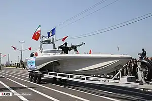 Sales of Bladerunner 51 were blocked to Iran by the west; however, in 2009, Iran managed to obtain one from a South African arms dealer.[3] Iran created its militarized version of Bladerunner 51, named Seraj-1, in 2010.[4] The designer of Bladerunner, Lorne Campbell, expressed his frustration that Iran had copied his design.[3] Commander of IRGC Naval Force, Rear Admiral Ali Fadavi said that the Seraj-1 will be mass-produced from March 2011 to March 2012.[2] Fadavi has also announced that Iran's navy aims to increase the speed of the militarized boats to 80-85 knots in the near future, and even up to 100 knots thereafter.[2] These planned speed boats would most probably be named Seraj-2, Seraj-3 etc., since boats with that speed and the stability to carry weapons would depend on the Seraj-1 design.