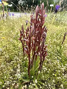 The inflorescence is composed by a narrow and elongated spike, with three to ten flowers. The relevant bracts are lanceolate and much longer than the tepals. Their color is red-purple, with darker longitudinal venation. The outer tepals are lanceolate and erect, forming an helmet-like structure. Their color is purple-red or pinkish, with veins of darker color. The internal lateral tepals are brownish-purple and almost entirely hidden by the helmet.