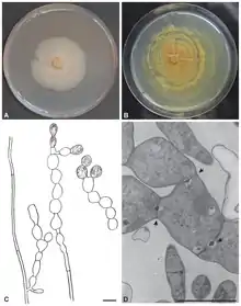 | Morphology of Serendipita herbamans: (A) Colony after two weeks of inoculation on MYP agar. (B) Colony after 6 months of inoculation on MYP agar. (C) Cylindrical and monilioid hyphae without clamps. Older monilioid hyphae become slightly yellow coloured. (D) Transmission electron micrographs showing monilioid hyphae with a septal porus at the constrictions (arrows). Scale bar C, D = 5 µm. | |