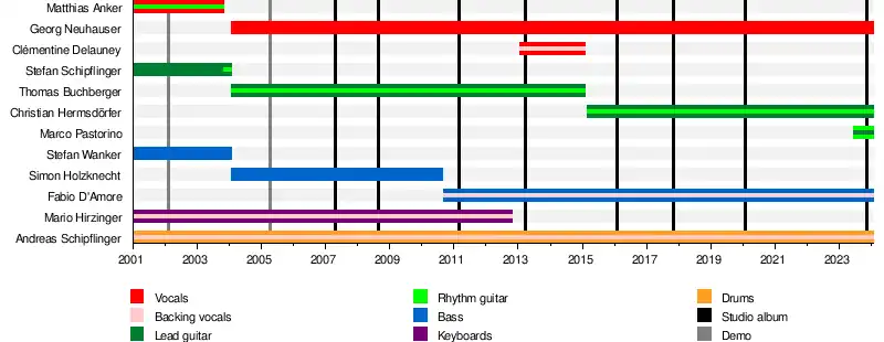 Serenity began in 2001[6] with Matthias Anker (rhythm guitarist & lead vocals), Stefan Schipflinger (lead guitarist), Stefan Wanker (bass guitarist), and current drummer Andreas Schipflinger, and until 2012, keyboardist Mario Hirzinger.[7]