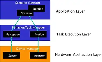 Three-layered software architecture, which can provide flexibility, maintainability, reusability and scalability is used when an effective robot software design is needed. The HAL (Hardware Abstract Layer) provides a relatively uniform abstraction for aggregates of underlying hardware such that the underlying robotic hardware is transparent to the robot control software. This robot control software can be written in a hardware independent manner.