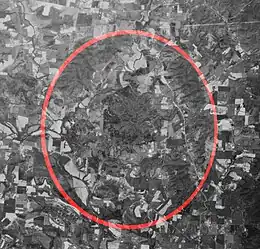 Air photo showing the perimeter of Serpent Mound crater, in 1974