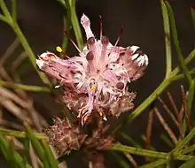 Serruria inconspicua, the cryptic spiderhead, is a flowering shrub that belongs to the genus Serruria and forms part of the fynbos. The plant is endemic to the Western Cape, where it occurs from the Cape Peninsula to Houhoek. The shrub is flat and grows 20 cm high. The plant gets its name from the fact that the flowers are inconspicuous.