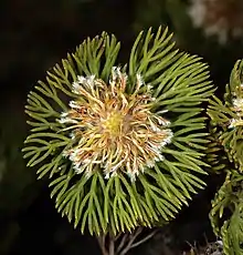 Serruria villosa, the golden spiderhead, is a flower-bearing shrub that belongs to the genus Serruria and forms part of the fynbos. The plant is native to the Western Cape, where it occurs only on the Cape Peninsula and just south of Constantia. The shrub is erect and grows only 50 cm tall and bears flowers from April to July.