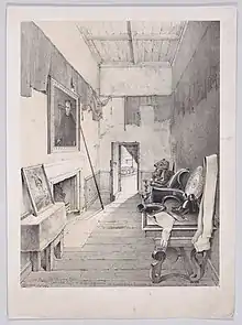 Soon after Mary's arrival in Scotland, in September 1561, Servais de Condé worked in Holyrood Palace lining a cabinet room for the queen with 26 ells of a fabric called "Paris Green".[3] The Italian cloth merchant and financier Timothy Cagnioli advanced £500 Scots for the project.[4] The English diplomat Thomas Randolph mentions this cabinet as a space to which he was not admitted, where the queen withdrew to write letters and to weep.[5] Randolph instead met the queen and her council in her bed chamber.[6] Servais made furnishings for the bedchamber, including black cushions, a black tablecloth, and a suite of seat furniture in black velvet in November 1562.[7] According to Randolph and Bedford's description of the murder of David Riccio, the cabinet was 12 feet square, furnished with a reposing bed and a table seating three.[8]
