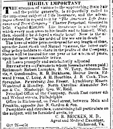 C. R. Bricken sold slave insurance, and listed a number of notable slave traders (including Seth Woodroof, Robert Lumpkin, Silas Omohundro, Hector Davis, Solomon Davis, and R. H. Dickinson) as references to whom "losses had been paid" (Richmond Enquirer, November 6, 1855)