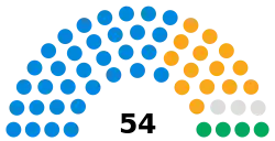 Since the last full review of boundaries in 2003 the council has comprised 54 councillors, representing 26 wards. Elections are held every four years.[9]