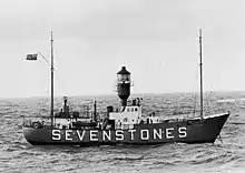 Sevenstones Lightship is a lightvessel station off the Seven Stones Reef which is nearly 15 miles (24 km) to the west-north-west (WNW) of Land's End, Cornwall, and 7 miles (11 km) east-north-east (ENE) of the Isles of Scilly. The reef has been a navigational hazard to shipping for centuries with seventy-one named wrecks and an estimated two hundred shipwrecks overall, the most infamous being the oil tanker Torrey Canyon on 18 March 1967.[1][2] The rocks are only exposed at half tide. Since it was not feasible to build a lighthouse, a lightvessel was provided by Trinity House. The first was moored near the reef on 20 August 1841 and exhibited its first light on 1 September 1841. She is permanently anchored in 40 fathoms (73 m) and is 2.5 miles (4.0 km) north-east (NE) of the reef.[3][4] Since 1987, the Sevenstones Lightship has been automated and unmanned.[1]