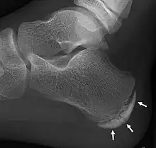 | X-ray of the foot of an 11-year-old child, showing sclerosis and fragmentation of the calcaneal apophysis. This is a sign of low sensitivity and specificity of Sever's disease, because those with Sever's disease may not have it, and this appearance is also present in feet without pain.[1] | |