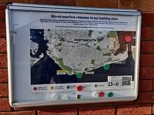 The UK has a combined sewage system, meaning rainwater and wastewater are discharged through the same pipes. During heavy rainfall, this system's capacity can be exceeded, leading to water companies discharging sewage into rivers and lakes.[1][2] Some water companies also have been suspected of illegally discharging on dry days.[3] Sewage discharge has led to health warnings at popular recreational beaches.[4]