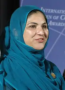 She was awarded with the International Women of Courage Award by the US First Lady Michelle Obama and the Secretary of State Hillary Clinton on Thursday 8 March 2012.[3] The area where she comes from is very conservative and there are very few working women. She had requested several news reporters not to spread the news because of security reasons.[4]
