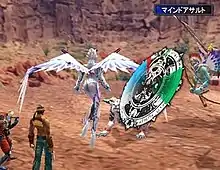 The turn-based battles are triggered through both random and scripted encounters.[4] Each player character has hit points (health), skill points (magic), and sanity points (SP). SP ordinarily decrease once per turn, and when a character runs out of SP they go berserk and cannot be controlled by the player.[1] Each character has two basic attack types; single attacks which range from normal attacks to powerful "Hard Hit", and double attacks which allow one character to take two actions in a single turn.[5][6]