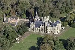 The result of Blore's, and then Teulon's, efforts, is decidedly vertiginous; Historic England notes the "balanced asymmetry and strikingly punctuated skyline".[21] The building is of three storeys on some fronts, and four on others, with a range of turrets and towers. Jill Franklin notes the diagonal staircase tower as one of the earliest examples of its type.[22] The building materials are Caen stone, brick and flint, with slate used for roofing.[21] The climax of the interior is Teulon's cruciform central hall, with stained glass, an organ and a timber roof with elaborate carving by Thomas Earp.[2] Mark Girouard, the architectural historian, considers Shadwell among Teulon's best work; "a dazzling display of Victorian fireworks, in its way a work of genius".[23]