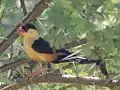 The shaft-tailed whydah or queen whydah (Vidua regia) is a small, sparrow-like bird in the genus Vidua. During the breeding season the male has black crown and upper body plumage, golden breast and four elongated black tail shaft feathers with expanded tips. After the breeding season is over, the male sheds its long tail and grows olive brown female-like plumage.