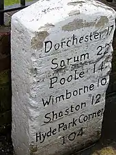 Old milestone in Blandford Forum showing use of the name Shaston for Shaftesbury