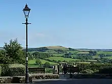 The old centre of Shaftesbury is sited on a westward-pointing promontory of high ground in northeast Dorset, on the scarp edge of a range of hills that extend south and east into Cranborne Chase and neighbouring Wiltshire.[35][36] The town's built-up area extends down the promontory slopes to lower ground at St James, Alcester and Enmore Green, and eastwards across the watershed towards the hill's dip slope.[35] Shaftesbury's altitude is between about 165 metres (541 feet) at the lowest streets below the promontory, to about 235 m (771 ft) at Wincombe Business Park on the hilltop in the north, with the promontory and town centre being at about 215 m (705 ft).[35] Below the town to the west is the Blackmore Vale, which undulates between about 60 and 110 m (200 and 360 ft).[37] About 2 mi (3 km) west of the town and within the Blackmore Vale is the conical mound of Duncliffe Hill, visible for miles and home to Duncliffe Wood and a nature reserve. The countryside east of the town is part of the Cranborne Chase and West Wiltshire Downs Area of Outstanding Natural Beauty.[38]