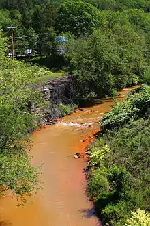 The entire length of Shamokin Creek is designated as impaired due to high levels of metals from abandoned mine drainage. In addition to abandoned mine drainage, the creek is impacted by sewage, disruption of the area's natural hydrology, and probably nutrient pollution, sediment, and low levels of dissolved oxygen.[4] Non-polluted streams in the creek's lower reaches dilute the pollution by more than doubling Shamokin Creek's discharge. However, impairments remain as far downstream as the creek's mouth in Sunbury. There are dozens of abandoned mine drainage discharges in the watershed's upper reaches.[5] Some discharges lead into the watershed of Mahanoy Creek, which has some mine drainage discharges that flow back into the Shamokin Creek watershed.[6]