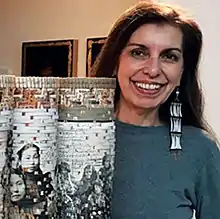 Shan Goshorn (July 3, 1957 – December 1, 2018) was an Eastern Band Cherokee artist, who lived in Tulsa, Oklahoma. Her interdisciplinary artwork expresses human rights issues, especially those that affect Native American people today. Goshorn used different media to convey her message, including woven paper baskets, silversmithing, painting, and photography. She is best known for her baskets with Cherokee designs woven with archival paper reproductions of documents, maps, treaties, photographs and other materials that convey both the challenges and triumphs that Native Americans have experienced in the past and are still experiencing today.