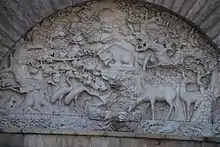 An art program, completed by local artists under the direction of the Shanghai Art Association, was commissioned for the building. While interior decorations have been overhauled over the years, much of the original relief sculpture work is still visible in various parts of the complex.[2] The central spire is topped by a prominent red star modeled on the Kremlin stars. Originally, a monumental sculpture stood at the base of the central tower, showing a Chinese worker and a Russian worker standing together, each holding up a hammer. This was removed following the Sino-Soviet split, the space now taken up by a bronze statue of a worker holding up a tangle of flowing ribbons.