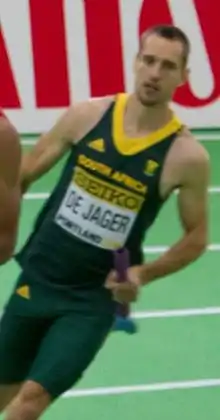 At the 2012 Summer Olympics, de Jager was part of the South African team in the 4x400 metres relay race. In the first semifinal, Ofentse Mogawane fell and dislocated his shoulder when he collided with Kenya's Vincent Kiilu, resulting in South Africa's withdrawal from the race.[3] South Africa was passed into the final on appeal to the IAAF, due to interference from the Kenyan athlete who downed Mogawane. They were assigned the 9th lane[4] and finished in 8th place with their season's best time of 3:03.46.[5]