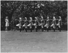 Men laboring in CCC camps were highly amused by the female counterpart. Writing for a CCC newspaper, one noted how little work women at Camp TERA did, adding, "Some of the girls are pretty. All are happy. They say they may never want to go back to New York, from where they came. Life has been tough for most of them."[14] Pauli Murray, who would later become a lawyer, writer, black civil rights activist, and episcopal priest, arrived at Camp TERA on the advice of her doctor at the end of 1933. Living on the edge of poverty and diagnosed with pleurisy, she found her time there cut short after she clashed with the camp's director, Miss Mills. An ambulance driver during World War I and an authoritarian, Mills attempted to run the camp on semi-military lines. Murray had a copy of Das Kapital in her bags and when director Mills found it, she ejected her from the camp. Murray would later become a close friend of Eleanor Roosevelt. That leftist songs sung at camp sing-alongs became a focus of detractors. It was not surprising that there were leftists in the camps, given that they were not far removed from the "Hoovervilles", and the troubadour-style of fellow travelers like singer Woody Guthrie fueled these sing-alongs. It also was not surprising that in 1936 controversies over communist influences enveloped the camp. In July 1936, the American Legion of Rockland County accused Camp TERA officials of using Federal funding for communist purposes. The new Director, Bernice Miller, countered the charges, saying that "the campers were permitted the completest freedom to say and discuss what they wanted, and sing any songs they wanted to". She also was quick to add that most supported the government. As to complaints of the Internationale and radical satires being sung, and that controversial material was being read, some, Miller admitted were "of communist and socialist persuasion".[15] Also adding to embarrassment, women from Camp TERA "escaped" and visited a men's CCC camp nearby. A teacher at Camp TERA, Harry Gersh, commented, "It was a most unnatural environment for these women. No one had thought that sexual isolation would be a problem".[16][17]
