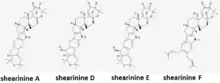 Shearinines A,D,E,and F, are marine fungal isolates with anticancer activity in vitro. They were isolated from a stain of Penicillium janthinellum Biourge. Their potential anticancer activity has been suggested by their induction of apoptosis in HL-60 cells.[1] Shearinines D, E and G have also been found to block activity on large-conductance calcium-activated potassium channels.[2]